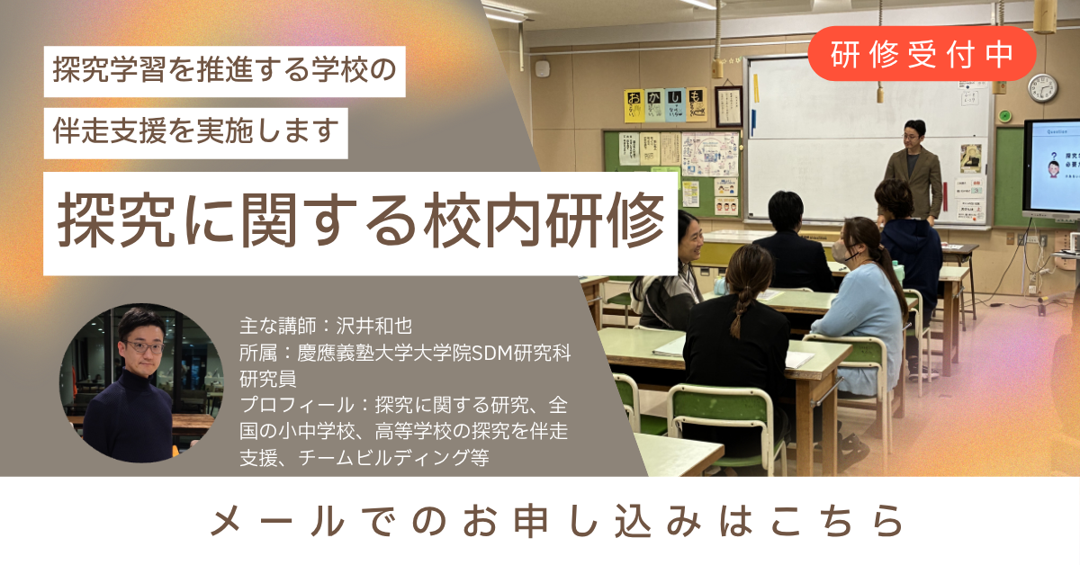 本オンライン研修では、総合的な学習の時間、探究の時間や他教科領域において「探究学習の実践を始めたい」「実践したいが何をしたらよいかわからない」という先生方のために、理論から実践方法までを講義・ワーク・実践を通して学んでいただく内容となっています。現場で試行錯誤している先生方、これから教壇に立つ予定の学生など、多くのかたにフィットした内容を準備しておりますので、お気軽にお申し込みください。